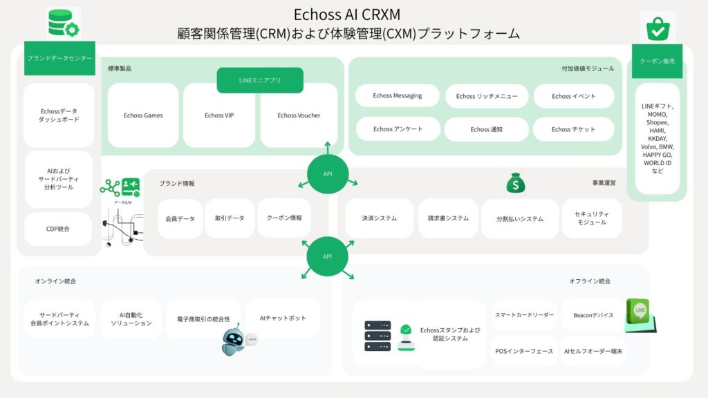 Echoss AI CRXMは、モジュール型かつ API連携のアーキテクチャを採用し、Echoss VIP、Echoss Voucher、Echoss Gamesといった標準化されているコアシステムに、オンラインとオフラインの接点をシームレスに結びつける柔軟なエンゲージメントモジュールを組み合わせています。AI は、パーソナライズ、自動化、意思決定支援のために実践的に活用され、企業がデータ、プロセス、ガバナンスを完全にコントロールできる設計となっています。