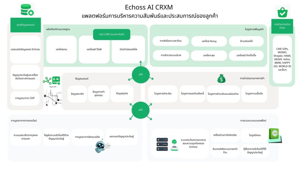 Echoss AI CRXM ได้รับการออกแบบด้วยสถาปัตยกรรมแบบโมดูลาร์และขับเคลื่อนด้วย API โดยผสานระบบแกนหลักที่เป็นมาตรฐาน เช่น Echoss VIP, Echoss Voucher และ Echoss Games เข้ากับโมดูลการมีส่วนร่วมที่ยืดหยุ่น ซึ่งเชื่อมโยงจุดสัมผัสทั้งออนไลน์และออฟไลน์ได้อย่างไร้รอยต่อ AI ถูกนำมาใช้อย่างเหมาะสมเพื่อสนับสนุนการปรับแต่งเฉพาะบุคคล ระบบอัตโนมัติ และการตัดสินใจ โดยยังคงให้ธุรกิจสามารถควบคุมข้อมูล กระบวนการ และการกำกับดูแลได้อย่างเต็มที่